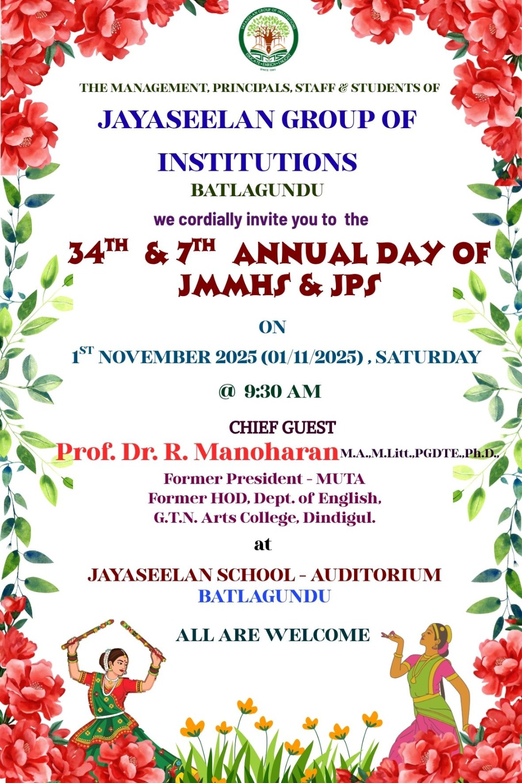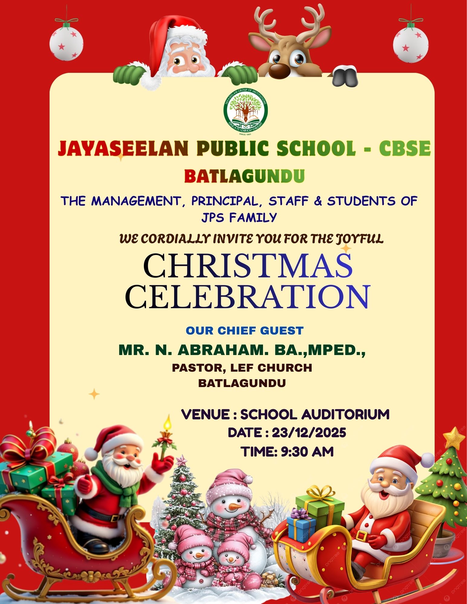 Jayaseelan School was Started in the year 1986 with 10 students and a teacher in a Small Hamlet near uthappanayackanur by Mr.S.Arulmanickam Founder of the school. His main vision is to give quality education to the students in rural and remote areas . Earlier he used to ride tricycles to deliver students to the schools inorder to give the students a proper education.with the hard work of Founder Mr.S.Arulmanickam and his wife ROSE sumathi whom she left government job inorder to give children a effective education. With most of their life they spent for education.with the hard work and dedication our jayaseelan school from a humble background ,now developed into five branches. 3 matriculation schools, 1 tamil Medium school and 1 CBSE school in batlagundu. More than 36 years of experience in educational development we're growing stronger because of our vision.